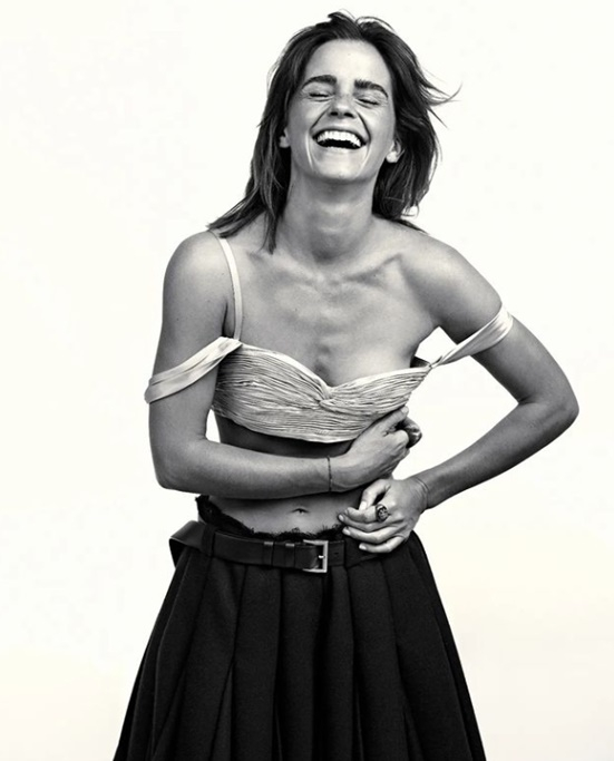 공개 된 사진 속 엠마 왓슨은 흘러내리는 짧은 톱을 입고 상체를 살짝 숙인 채 환하게 웃고 있다. 얼굴은 메이크업을 거의 하지 않은 듯 자연스러운 모습이다. 엠마 왓슨은 쇄골과 가슴뼈가 드러나며 깡마른 몸매를 자랑한다.