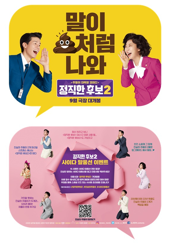 공개된 스페셜 전단의 앞면은 '정직한 후보2' '주상숙'(라미란 분), '박희철'(김무열 분)의 모습과 함께 "말이 똥처럼 나와"라는 카피로 두 사람이 '진실의 주둥이'를 쌍으로 얻었음을 예고한다. 이어 속에 담아두었던, 차마 하지 못했던 말들을 속 시원히 내뱉는 것 같은 두 사람의 모습은 웃음을 전한다.