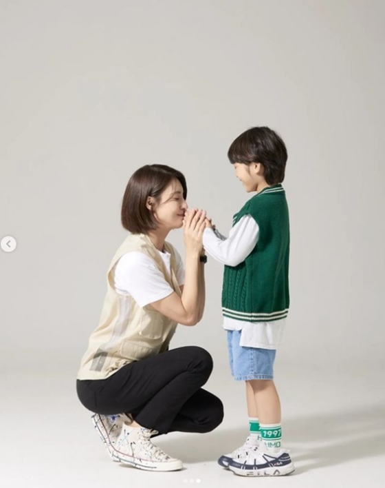 공개 된 사진 속 김정화는 희망친구 기아대책 촬영을 함께 하는 모습. 김정화와 똑 닮은 귀여운 아들의 환한 미소가 시선을 사로잡는다.