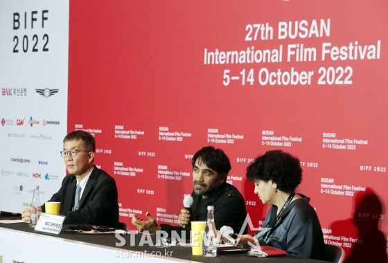 이란 하디 모하게흐 감독이 5일 오후 부산 해운대구 영화의 전당 중극장에서 진행된 제27회 부산국제영화제(BIFF) 개막작 '바람의 향기' 기자회견에 참석해 인사말을 하고 있다.