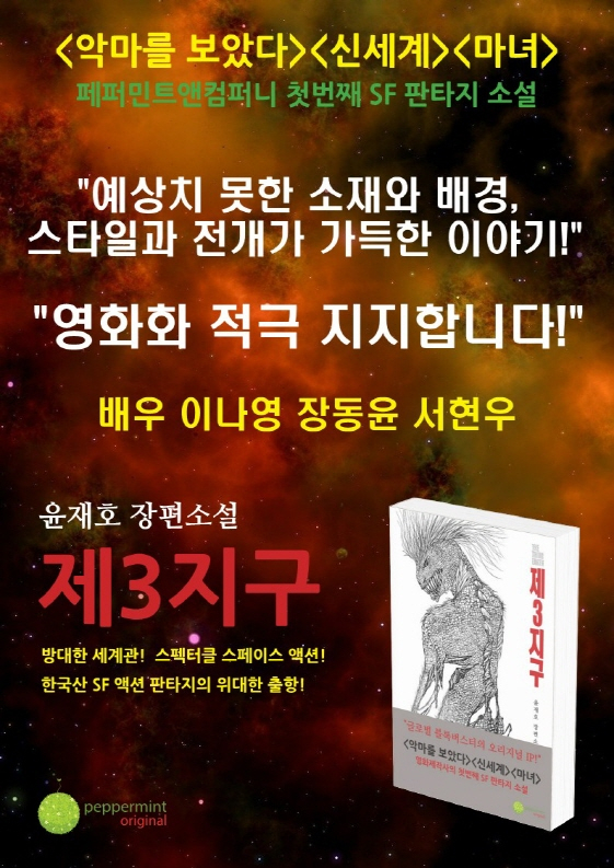 2일 페퍼민트오리지널은 '제3지구'가 텀블벅 크라우드 펀딩 성공과 한국문화예술위원회 후원을 통해 국내 서점가에 공식 출간된다고 알렸다. '제3지구'는 한국에서는 흔치 않았던 '스페이스 오페라' 장르의 SF소설로 영화감독 윤재호의 소설가 변신과 '악마를 보았다''마녀' 등 의 제작사 퍼민트앤컴퍼니(대표이사 김현우)가 출판사 등록을 하고 출간하는 첫 소설이다.