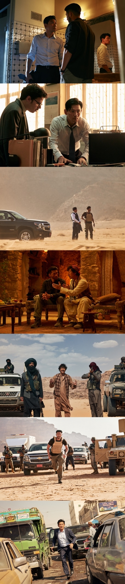 대한민국 대사관에서 한껏 긴장한 표정으로 탈레반의 메시지를 듣고 있는 '재호'와, 바이크를 탄 액션 직전의 '대식'의 모습 또한 둘 사이의 대조를 뚜렷하게 보여준다. '박대식' 역의 현빈과 함께 상의하고 있는 '카심' 역의 강기영의 모습은 이들의 협업을 궁금하게 하는 한편, 총을 든 탈레반 사이, 겁에 질린 듯 서 있는 스틸은 현지 유일의 통역으로 '교섭' 작전에 함께 하게 된 그가 처한 위험을 보여준다. 또 무장한 군인들을 뒤로 한 채 사막 한가운데, 방탄조끼를 입고 다급하게 뛰어가고 있는 현빈과 테러 직후, 엉망이 된 도로를 힘겹게 뛰어가는 황정민의 모습은 목숨을 구하기 위해 목숨을 건 이들의 절박함과 동시에 교섭 작전 속에서 펼쳐질 필사적인 액션을 기대하게 만든다.