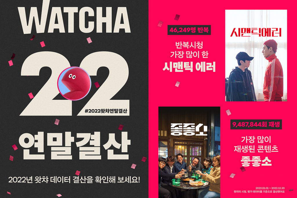 왓챠 관계자는 "스트리밍을 통한 콘텐츠 감상이 더욱 보편화되며 왓챠는 올해 전년 대비 평균 방문일수가 42% 상승하는 등 구독자들과 더욱 가까워졌다"며 "무엇보다 '좋좋소', '시맨틱 에러' 등과 같이 참신하고 다양한 소재의 콘텐츠를 세상에 알리고 선보일 수 있어 매우 기쁘고, 사랑해주고 시청해주신 이들에게 감사드린다"고 말했다.