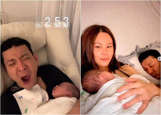 영상 속 정성호는 최근 출산한 다섯째를 가슴에 품고 하품을 하고 있다.