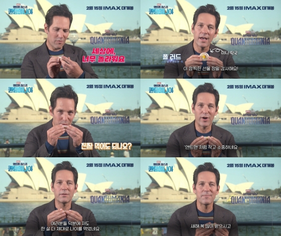 "먹어버릴까? 맛있어 보이네요"라며 특별 제작된 소품에 신기함을 드러낸 폴 러드는 계속해서 감탄을 아끼지 않았다. '미니 떡국'을 "앤트맨처럼 작고 소중하네요"라고 표현한데 이어 "한국에서는 떡국을 먹어야 비로소 한 살을 더 먹는다고 들었는데, 덕분에 제대로 나이를 먹었네요"라며 '미니 떡국'의 냄새를 맡고, 맛을 보는 듯한 센스 넘치는 리액션으로 온 마음을 전했다. 마지막으로 "새해 복 많이 받으세요"란 끝인사와 함께 15일 개봉하는 '앤트맨과 와스프: 퀀텀매니아'의 필람 포인트를 전하기도 해 눈길을 끌었다.