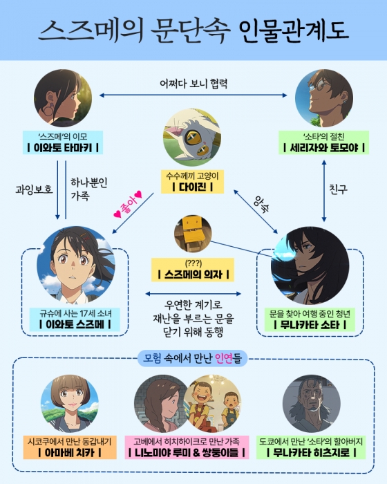 이뿐만 아니라 모험 속에서 만난 인연들도 이목을 집중시킨다. 시코쿠에서 만난 동갑내기 '치카'를 비롯해 고베에서 히치하이크로 만난 '루미'와 쌍둥이들, 그리고 도쿄에서 만난 '소타'의 할아버지 등은 고향을 떠나온 '스즈메'에게 소중한 인연이 되어주며 각기 다른 매력으로 깨알 재미를 선사할 예정이다. 이처럼 '스즈메'가 문단속 여정을 통해 새롭게 마주하는 인연들을 총망라한 인물관계도는 '스즈메의 문단속'이 선사할 특별한 모험에 대한 기대감을 고조시킨다.
