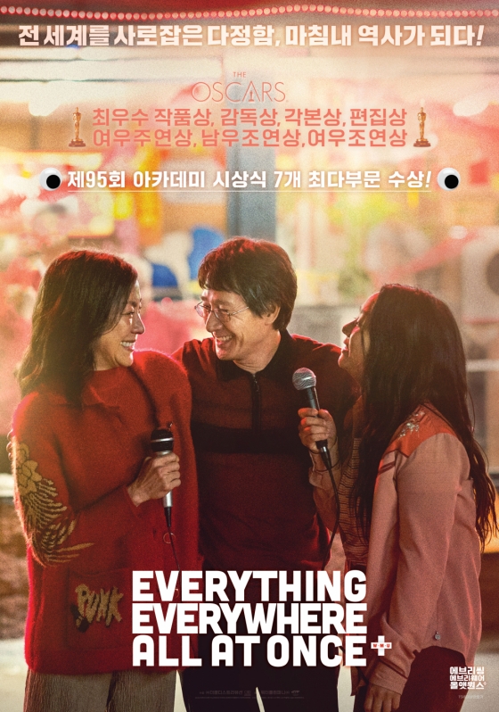 한편, '에브리씽 에브리웨어 올 앳 원스'가 제95에 아카데미 시상식 최다 수상에 맞추어 포스터를 공개했다. 수상 기념 포스터에는 영화 속 따스하면서도 뭉클했던 엔딩 장면을 담아 영화가 전하는 메시지의 정수가 느껴지는 동시에 "전 세계를 사로잡은 다정함, 마침내 역사가 되다!"라는 카피가 어우러져 이들이 쓴 기적의 피날레를 축하하고 있다.