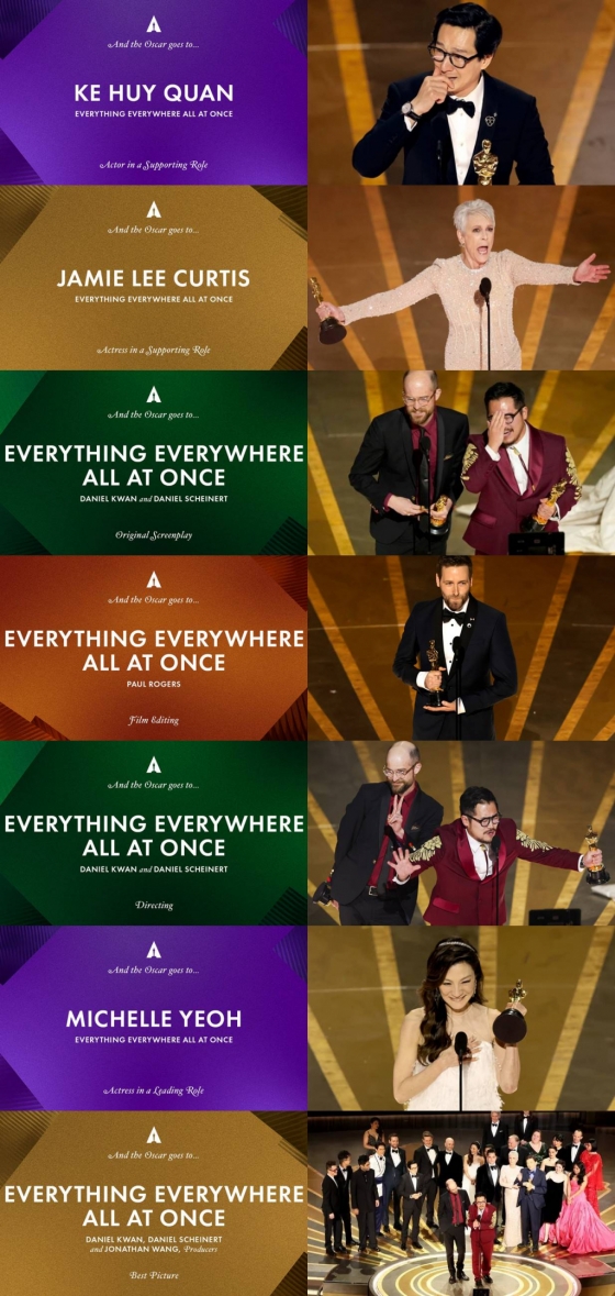 미국 현지 시각으로 12일 LA 할리우드 돌비 극장(Dolby Theater)에서 열린 '제95회 아카데미 시상식'에서 영화 '에브리씽 에브리웨어 올 앳 원스'가 작품상, 여우주연상, 감독상, 편집상, 각본상, 여우조연상, 남우조연상까지 무려 주요 부문 7개를 휩쓸며 올해 아카데미 최다 수상, 시상식 무대의 주인공으로 기록되었다.