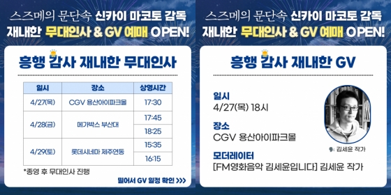 이는 처음 공약으로 내걸었던 300만 관객을 훌쩍 넘는 수치로, 역대 국내 개봉 일본 영화 흥행 1위의 자리까지 석권하며 뜨거운 흥행 릴레이를 이어가고 있다. 신카이 마코토 감독은 국내 관객들의 열띤 성원에 보답하고자 서울, 부산, 제주까지 방문하는 행보를 펼칠 예정으로, 팬들의 뜨거운 호응이 예고된다.