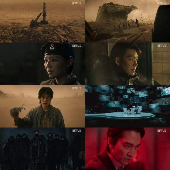 공개된 예고편은 '택배기사' 세계관의 거대한 스케일을 짐작하게 만든다. 40년 전 한반도는 사막으로 변했고 단 1퍼센트만의 생존자만이 살아남았다. 서울의 랜드마크가 보이지만 익숙했던 도심과 자연은 온데간데없고, 모래로 가득 찬 한강, 반으로 부서진 N서울타워 등 황폐화된 서울 전경이 시선을 사로잡는다.