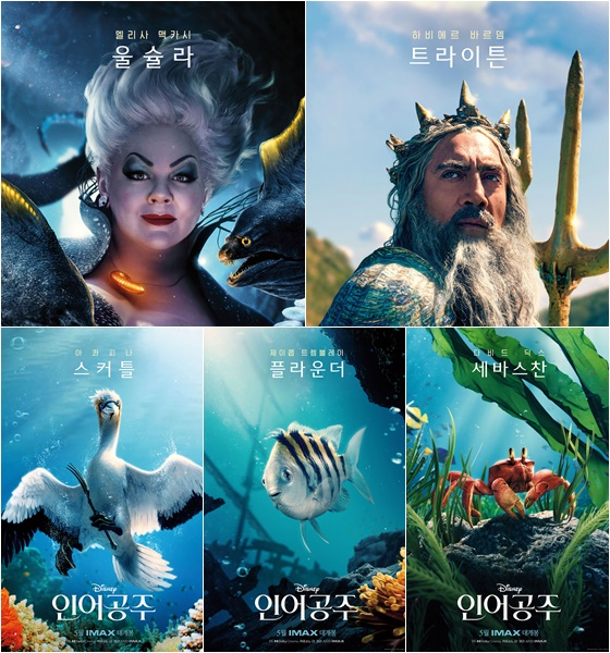 바다를 지배하려는 바다 마녀 '울슐라'(멜리사 맥카시 분)의 포스터는 음산한 분위기를 고스란히 담아내며 다른 캐릭터들과 어떤 갈등을 빚을지 호기심을 자극한다. 이에 맞서 가족과 왕국을 지키고자 하는 '에리얼'의 아버지이자 바다의 왕 '트라이튼'(하비에르 바르뎀 분)의 포스터는 비장한 표정으로 시선을 사로잡고 배 위에서 넓은 바다를 바라보고 있는 듯한 '에릭 왕자'(조나 하우어 킹 분)의 포스터에는 모험심 가득한 '에릭 왕자'의 모습이 담겨 있다.