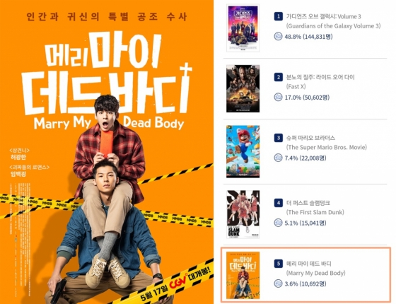 '메리 마이 데드 바디'(감독 청웨이하오)는 10일 오전 7시 기준 영화진흥위원회 통합전상망 집계 1만 692명의 예매를 기록하며 약 3.6%의 점유율을 확보했다. 이는 1위 '가디언즈 오브 갤럭시', 2위 '분노의 질주: 라이드 오어 다이', 3위 '슈퍼 마리오 브라더스', 4위 '더 퍼스트 슬램덩크'에 이어 예매율 외화 전체 5위에 해당하는 기록이다.