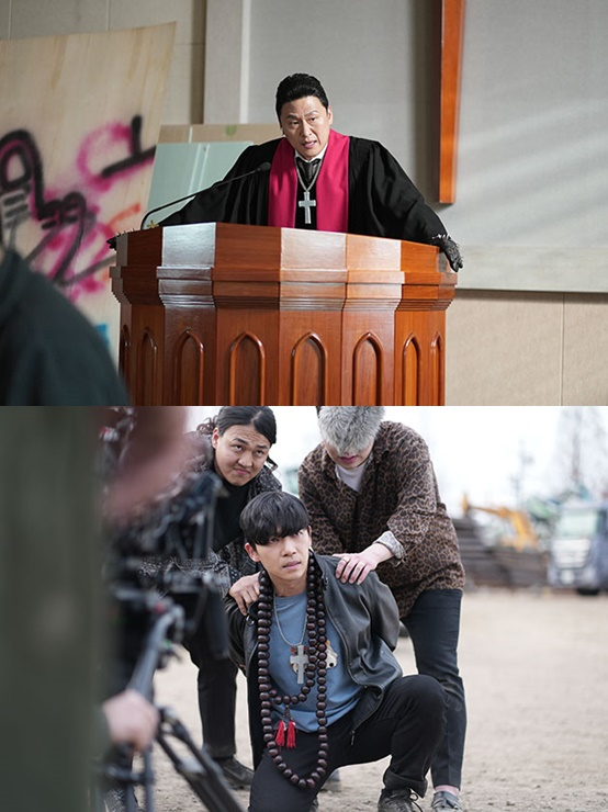 크랭크업 소식과 함께 공개된 보도 스틸에는 카리스마 가득한 모습으로 목사 복장을 하고 있는'곰 발바닥' 경철(오대환 분)의 진지한 연설 장면이 스토리에 호기심을 불러일으키고, 산내림을 억누르려 온갖 종교 액세서리를 두른 '미친개' 도필(지승현 분)의 비주얼이 눈길을 끈다.
