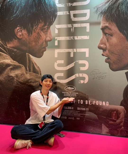 또 송중기는 올해 칸 국제영화제 초청을 받은 자신의 출연작 '화란' 포스터 앞에서 포즈를 취하고 있다. 여전히 소년같은 모습의 송중기는 신난듯한 모습이다.