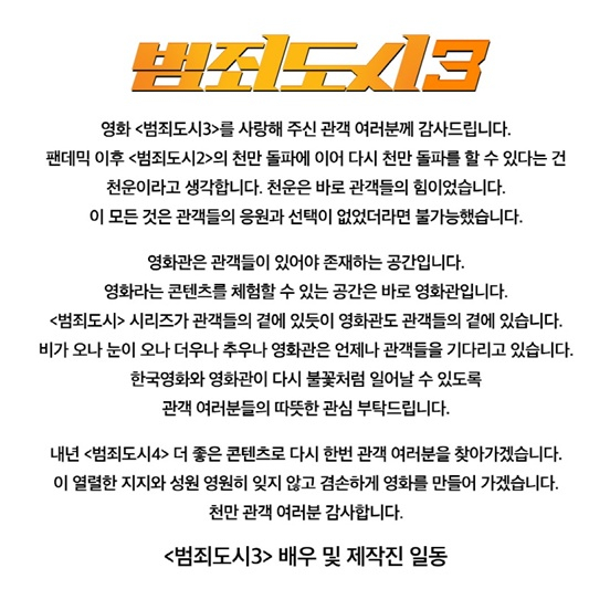'범죄도시3' 측은 "이 모든 것은 관객들의 응원과 선택이 없었다면 불가능했다"라며 "한국영화와 영화관이 다시 불꽃처럼 일어날 수 있도록 관객 여러분의 따뜻한 관심을 부탁드린다"라고 밝혔다.