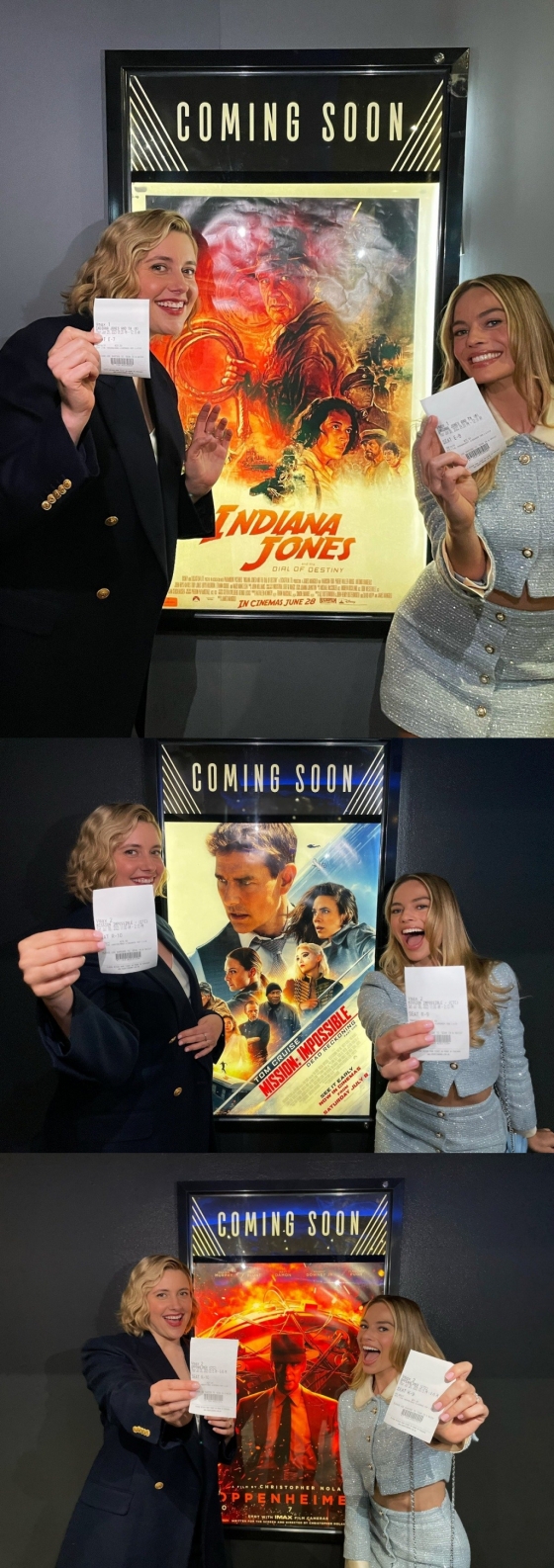 '바비'의 주연 마고 로비와 그레타 거윅 감독 또한 '인디아나존스: 운명의 다이얼', '오펜하이머', '미션 임파서블: 데드 레코닝 PART ONE'의 포스터 앞에서 티켓 인증샷을 찍어 눈길을 끌었다. 이들 모두 비슷한 시기에 개봉하는 작품들과의 경쟁보다는 윈윈 전략을 택하며 극장가를 살리는 데 마음을 모은 셈이다. 배우들의 바람대로 올여름 극장가에 출격하는 대작 블록버스터가 동시 흥행에 성공할 수 있을지 기대가 모아진다.