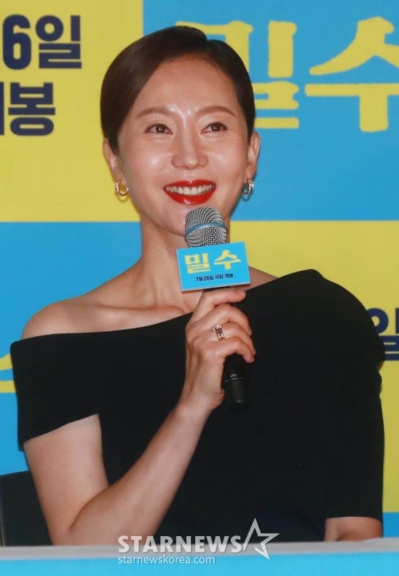 배우 염정아가 18일 오후 서울 CGV용산아이파크몰에서 진행된 영화 '밀수'(감독 류승완) 언론시사회에 참석해 질문에 답하고 있다. 바다에 던져진 생필품을 건지며 생계를 이어가던 사람들 앞에 일생일대의 큰 판이 벌어지면서 휘말리는 해양범죄활극 '밀수'는 7월 26일 개봉한다. /2023.07.18 /사진=이동훈 기자 photoguy@