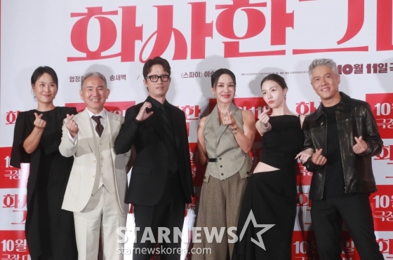 배우 김재화, 손병호, 송새벽, 엄정화, 방민아, 박호산이 5일 오후 서울 용산구 CGV용산아이파크몰에서 진행된 영화 '화사한 그녀'(감독 이승준) 언론시사회 및 기자간담회에 참석해 포즈를 취하고 있다. /2023.10.05