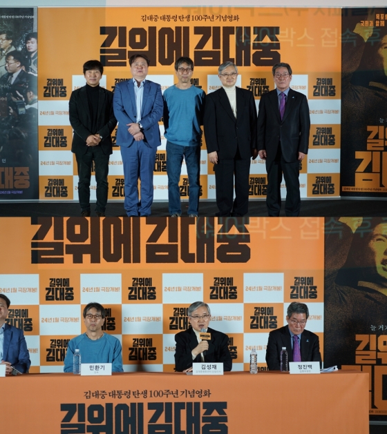 1일 CGV용산아이파크몰에서 열린 '길위에 김대중' 기자회견에는 김성재 김대중평화센터 상임이사와 정진백 김대중 대통령 영화 상영 위원회 위원장, 민환기 감독, 최낙용 시네마6411 대표, 이은 명필름 대표가 참석했다.