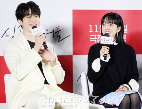 배우 이동욱, 임수정이 3일 오전 서울 광진구 롯데시네마 건대입구점에서 진행된 영화 '싱글 인 서울' 제작보고회에서 대화를 나누고 있다.