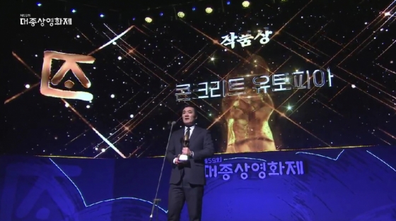 '콘크리트 유토피아' 제작을 맡은 변승민은 무대에 올라 "고생해 준 배우들, 장인 정신으로 붙잡아 준 엄 감독님에게 진심으로 감사하다. 뿌리를 잊지 않고 앞으로도 좋은 영화 많이 만들겠다"고 수상 소감을 밝혔다.