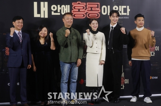 강윤성 감독, 배우 우혜림, 황찬성 등이 23일 오전 서울 CGV용산아이파크몰에서 진행된 글로벌 프로젝트 '홍콩 인 렌즈'(Hong Kong in the Lens)의 한국편 '내 안에 홍콩이 있다'(감독 강윤성) 쇼케이스에 참석해 포즈를 취하고 있다.