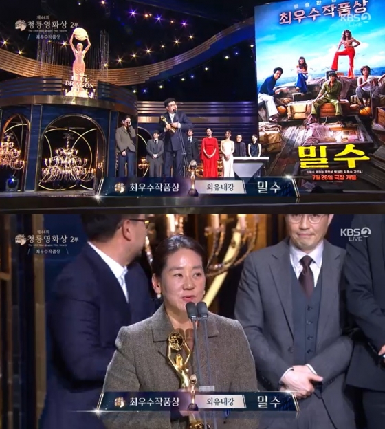 이날 청룡영화상 작품상은 류승완 감독의 '밀수'가 차지했다. 외유내강 강혜정 대표는 "올 여름 극장에서 '밀수'를 관람해주신 514만 관객분들 감사하다. 올 여름 쟁쟁한 영화 사이에서 밀수에 큰 상을 주신 심사위원단께 감사하다"라고 수상 소감을 밝혔다.