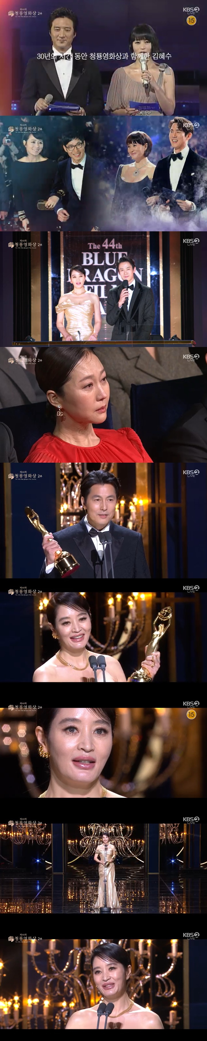 한편 1993년 제14회 청룡영화상 시상식부터 진행을 맡아 온 김혜수는 이날 제44회 청룡영화상 시상식까지 30년 연속 MC를 맡고 올해를 마지막으로 작별을 알렸다. 시상식 마지막에 정우성이 등장해 "청룡의 여인 김혜수에게 보내는 영화인들의 연설을 전하러 왔다"라며 "30년 넘게 청룡영화상을 이끈 김혜수란 사람을 어떻게 한 단어로 표현할 수 있을까. 영화인들이 김혜수를 통해 얻었던 위로와 지지, 영화와 영화인을 위한 김혜수의 뜨거운 지지가 있었기에 지금 청룡영화상이 있을 수 있었다. 청룡영화상이 곧 김혜수고 김혜수가 곧 청룡영화상인 시간이었다. 영원한 청룡의 여인 김혜수에게 이 청룡영화상이란 이름이 적힌 트로피를 전한다"라면서 김혜수에게 시상했다.