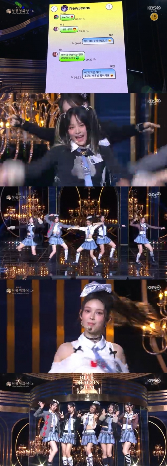 이어 뉴진스가 축하무대에 올라 눈길을 끌었다. 하니가 "혜인이 안 보이는데? Where are u?"라고 묻자 혜인은 "저 지금 여기! 조인성 배우님 옆이에요"라고 문자하며 무대에 올랐다.