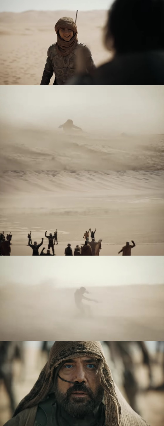티모시 샬라메가 연기한 폴은 이번 파트에서 마침내 모래벌레 위에 올라탈 수 있게 된다. 예고편으로도 공개된 이 장면은 폴의 성장과 비범한 능력을 엿볼 수 있는 대표적인 신이다. 관객들은 숨죽여서 지켜볼 폴의 라이딩을 위해 감독과 스태프는 나름의 고충을 겪었다고.
