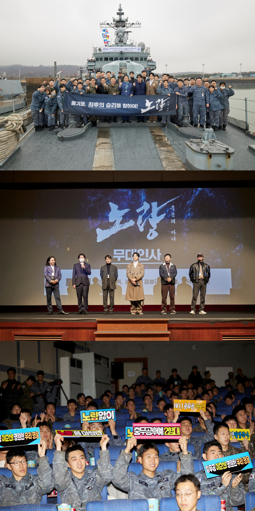 영화 상영에 앞서 영화의 주역 김한민 감독, 김윤석, 김성규, 이무생, 최덕문, 박훈은 을지문덕함(DDH-I)을 견학하고 청년 장병들을 격려했다. 김한민 감독은 "이렇게 장병들에게 영화를 상영 할 수 있어서 영광과 행운이다. '노량해전'이 어떻게 펼쳐지는지, 이순신 장군의 마지막 대의가 무엇이었는지 확인 부탁드린다"라고 대한민국을 수호하고 있는 젊은 장병들에게 응원과 감사의 마음을 전했다. 이순신 역의 김윤석은 "'노량: 죽음의 바다'를 해군 여러분들에게 선보일 수 있어서 정말 뜻깊다. 얼마나 대한민국 해군이 발전을 이루었는지, 400여년 전으로 거슬러 올라가 만끽하는 시간 되었으면 한다. 또한 이렇게 해군들과 함께할 수 있어서 마음이 뿌듯하다"고 소감을 전했다.