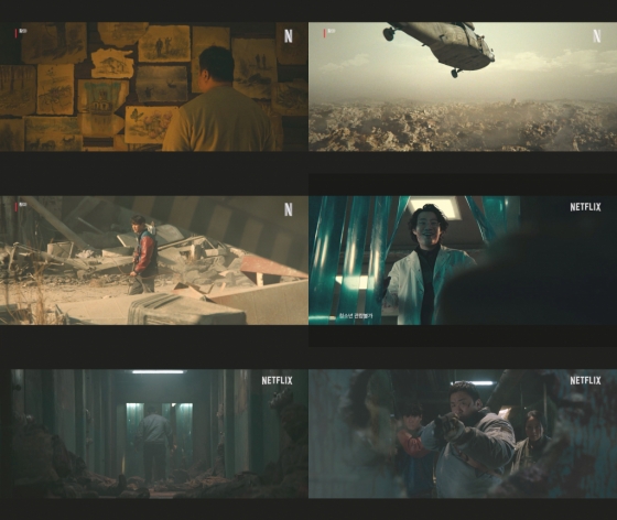 이어, 멸망한 세상 속에서 살아남은 유일한 의사인 '양기수'(이희준 분)가 무언가를 바라보며 섬뜩하게 웃는 모습은 그의 진짜 정체가 무엇인지 궁금증을 유발하며 긴장감을 고조시킨다. 뿐만 아니라, '남산'과 함께 사냥을 나서는 '남산'의 파트너 '지완'(이준영 분), 눈앞에 닥친 위기에 맞서는 폐허 속 살아남은 소녀 '수나'(노정의 분), '남산'과 함께 정체불명의 적을 처리하는 특수부대 소속 중사 '은호'(안지혜 분)의 모습은 이들이 써내려갈 액션 블록버스터의 대서사, '황야'에 대한 기대감을 한층 더 끌어올린다.