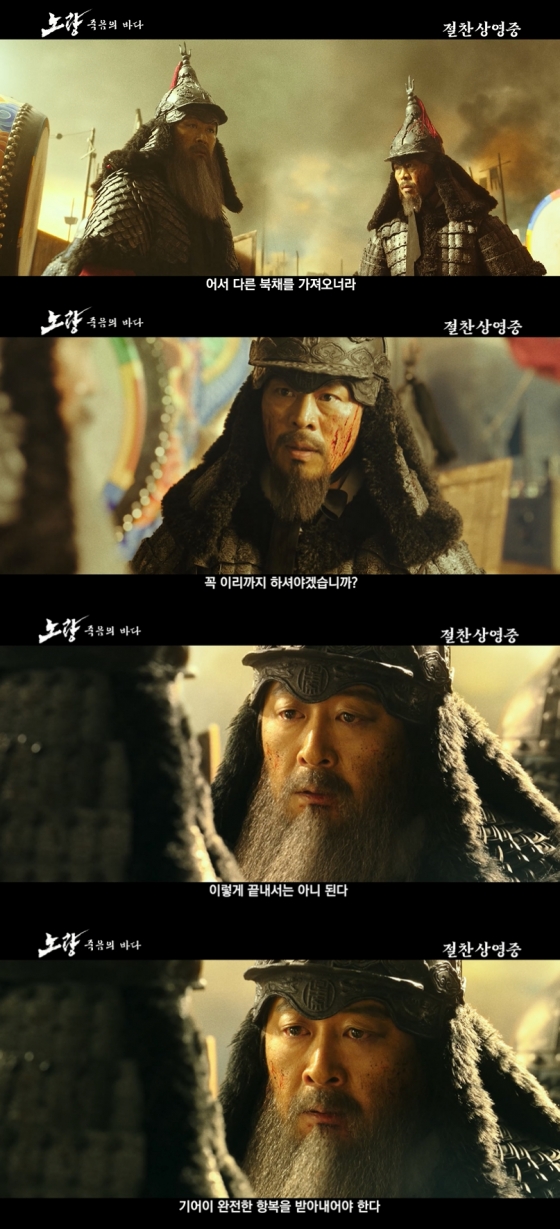 이순신 장군의 심복인 장군 송희립은 군사들의 사기를 북돋기 위해 직접 북채를 드는 이순신 장군을 향해 걱정의 마음을 담아 이렇게까지 하는 연유에 대해 묻는다. 이에 이순신 장군은 "저들은 이대로 보내면 장차 더 큰 원한들이 쌓이게 될 것이다"고 답하며 망설임 없이 진격의 북을 친다. 특히 "절대 이대로 이렇게 끝내서는 아니 된다. 이렇게 적들을 살려보내서는 올바로 이 전쟁을 끝낼 수 없다. 반드시 놈들을 열도 끝까지라도 쫓아서 기어이 완전한 항복을 받아내어야 한다"는 장군의 말씀은 완전한 종결을 이루고자 했던 유지를 그대로 보여준다.