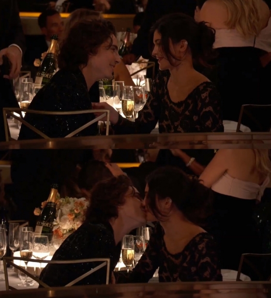티모시 샬라메와 카일리 제너는 블랙 의상으로 조화를 이루며 공식 커플 다운 면모를 자랑했고, 특히 광고 도중 몇 차례 키스를 나누는 장면이 포착되며 화제를 모았다. 골든글로브 시상식 공식 계정은 "티모시 샬라메와 카일리 제너의 밤 데이트"라는 내용으로, 해당 영상을 공개했다.