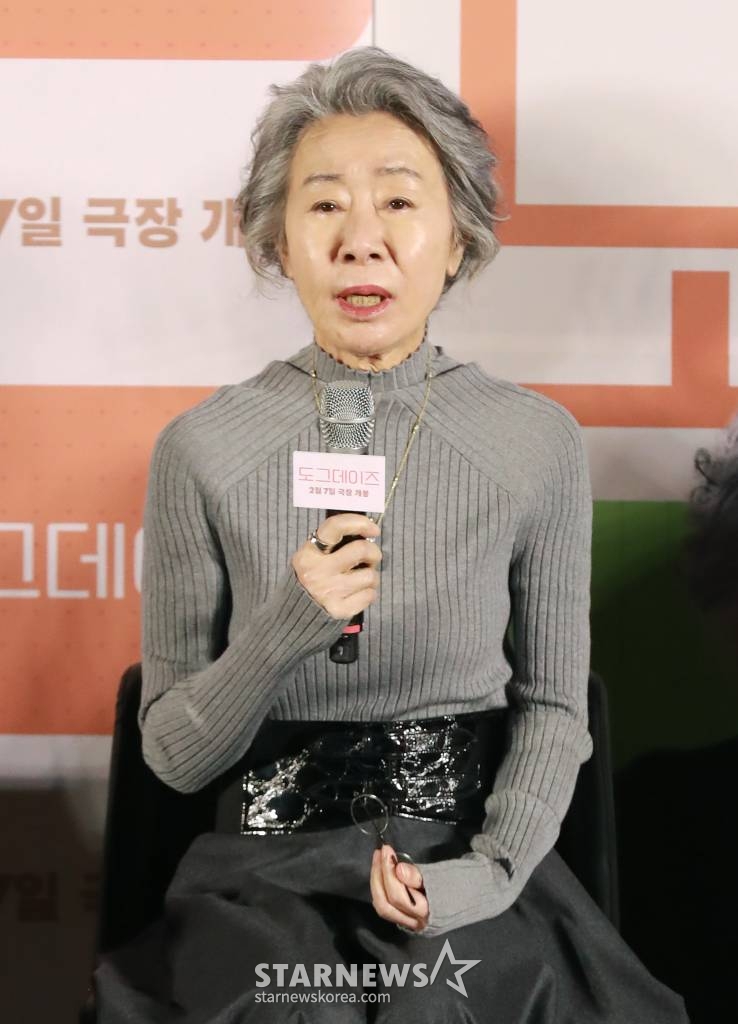 배우 윤여정이 10일 오전 서울 CGV용산아이파크몰에서 진행된 영화 '도그데이즈' 제작발표회에 참석해 질문에 답하고 있다. /2024.01.10 /사진=이동훈