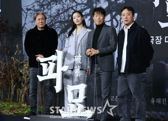 연예영화'파묘, 사랑해 주세요'[★포토]발행 : 2024.01.17 ・ 11:47이동훈 기자배우 최민식, 김고은, 유해진, 장재현 감독이 17일 오전 서울 더플라자 호텔에서 진행된 영화 '파묘'(감독 장재현) 제작발표회에 참석해 포즈를 취하고 있다.거액의 돈을 받고 수상한 묘를 이장한 풍수사와 장의사, 무속인들에게 벌어지는 기이한 사건을 담은 오컬트 미스터리 영화 '파묘'는 오는 2월 개봉 예정이다. /2024.01.17<저작권자 © 스타뉴스, 무단전재 및 재배포 금지>파묘최민식김고은유해진이도현장재현추천 기사이동훈 기자기자홈좋아요 연예-영화의 인기 급상승 뉴스연예-영화의 최신 뉴스
