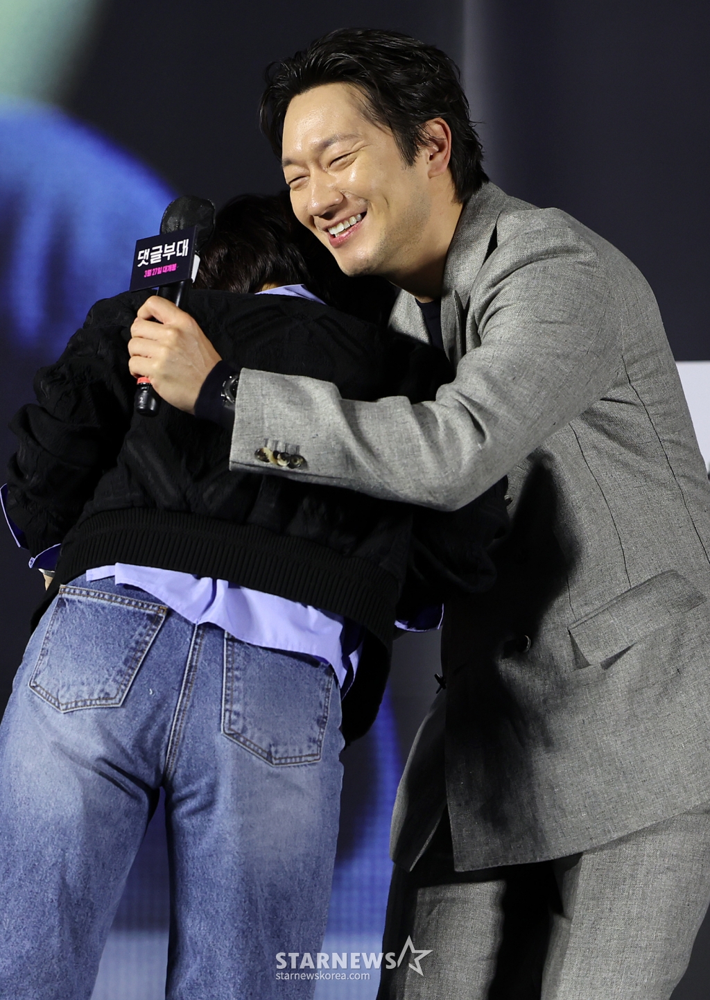 (서울=뉴스1) 김진환 기자 = 배우 손석구가 4일 서울 광진구 아차산로 롯데시네마 건대입구에서 열린 영화 ‘댓글부대’ 제작보고회에 참석해 진행을 맡은 박경림을 꼭 안아주고 있다. ‘댓글부대’는 대기업에 관한 기사를 쓴 후 정직당한 기자 임상진에게 온라인 여론을 조작했다는 익명의 제보자가 나타나면서 벌어지는 이야기를 다룬 영화로 오는 27일 개봉한다. 2024.3.4/뉴스1 Copyright (C) 뉴스1. All rights reserved. 무단 전재 및 재배포, AI학습 이용 금지. /사진=(서울=뉴스1) 김진환 기자