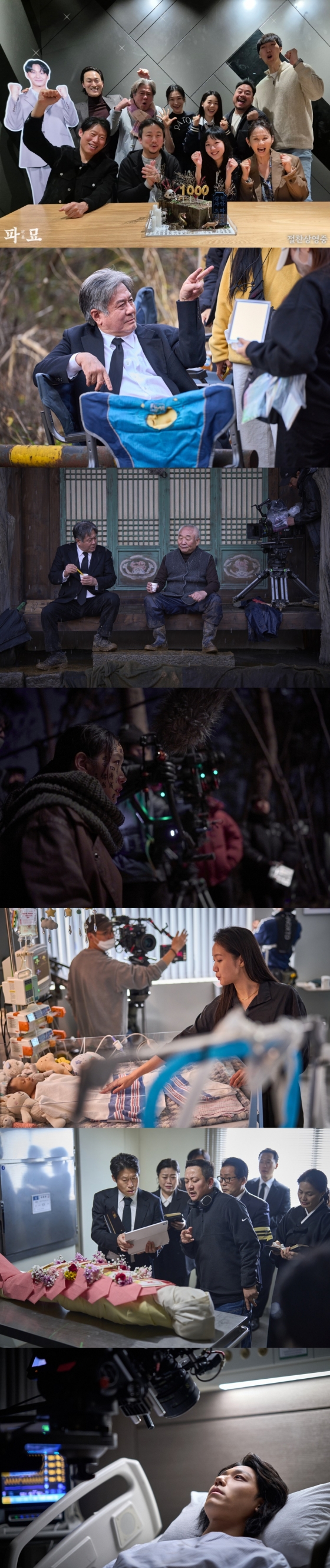 여기에, '파묘' 팀은 천만 돌파 기념 비하인드 스틸을 공개해 훈훈했던 현장 분위기를 전했다. 이번에 공개된 스틸에는 각자의 캐릭터를 완벽하게 그려내기 위한 배우들의 노력을 고스란히 담았다. 카메라 뒤편 영화의 캐릭터와 상반되는 장난기 가득한 포즈를 취하며 친근한 모습을 뽐내고 있는 모습은 유쾌한 현장 분위기를 짐작하게 하며 미소를 자아낸다. 또한 연기를 진지하게 모니터링하는 장면, 장재현 감독과 함께 의논하는 모습 등은 영화를 향한 '파묘' 팀의 뜨거운 열정과 애정을 보여주며 남다른 케미를 확인하게 한다.