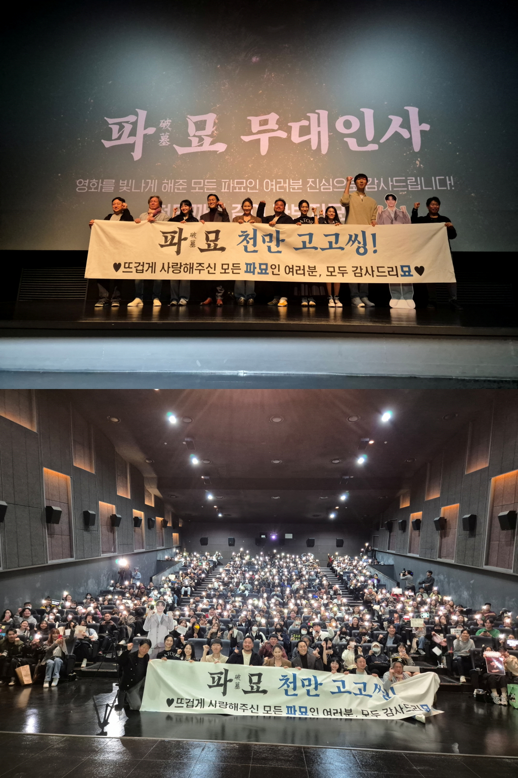 김재철, 김병오, 김지안, 김태준, 정윤하, 김선영은 각각 "관객분들의 많은 사랑으로 굉장히 뜨거웠던 한달을 보냈다", "천만 관객 달성이라는 긴 시간동안 함께해 주셔서 너무 감사하다", "이렇게 많은 사랑을 받을 수 있어서 너무 행복하다", "관객들과 만나는 이 순간이 너무 신기하고 영광스럽다", "관객분들 덕분에 무대인사에 참여할 수 있게 되어서 너무 영광이다", "관객분들 덕분에 처음 무대인사에 참여할 수 있게 되어서 너무 감사하다"라며 감사의 인사와 '파묘'에서 연기한 소회를 밝혔다. 장재현 감독은 "결국 마지막에 '파묘'를 완성해주시는 분은 관객분들 인 것 같다"라며 '파묘'를 사랑해 준 많은 팬과 극장을 찾아준 관객들을 향해 진심 어린 감사의 말을 전했다.