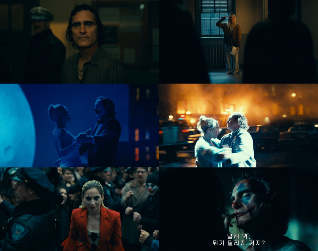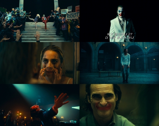 이어 수용소에서 함께 공연을 지켜보던 중 '할리 퀸'이 "나갈까요?"라고 말하자, 아름다운 선율은 격정적인 음악으로 뒤바뀌며 모두를 숨죽이게 만든다. 뒤이어 이어진 장면은 '조커'와 '할리 퀸'이 불길에 휩싸인 곳에서 춤을 추고, 수많은 이들 앞에서 짙은 화장을 한 채 "뭐가 달라졌냐고? 더 이상 혼자가 아니야"라 외치는 장면이 그려지며 앞으로 이들에게 어떤 일들이 펼쳐지게 되는지 궁금증을 자아낸다.