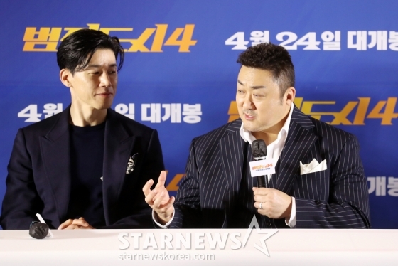 배우 마동석이 15일 오후 서울 코엑스 메가박스에서 열린 영화 '범죄도시4' 언론시사회에 참석해 취재진의 질문에 답하고 있다. 2024.04.15 /사진=임성균