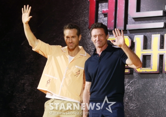 영화 '데드풀과 울버린'의 배우 라이언 레이놀즈, 휴 잭맨이 4일 오전 서울 포시즌스 호텔에서 진행된 내한 기자간담회에서 포즈를 취하고 있다.
