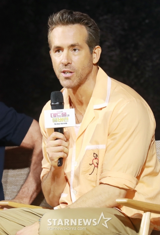 영화 '데드풀과 울버린'의 배우 라이언 레이놀즈가 4일 오전 서울 포시즌스 호텔에서 진행된 내한 기자간담회에서 질문에 답하고 있다.