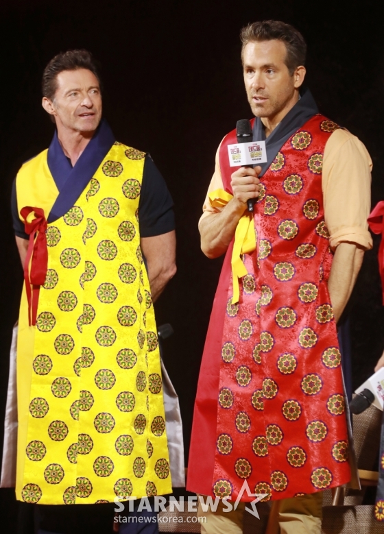 영화 '데드풀과 울버린'의 배우 휴 잭맨, 라이언 레이놀즈가 4일 오전 서울 포시즌스 호텔에서 진행된 내한 기자간담회에서 질문에 답하고 있다.
