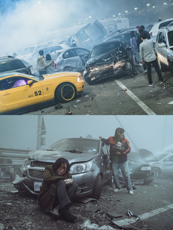 실제 공항대교에 버금가는 세트를 제작한 데 이어, 100중 추돌 사고 장면을 위해 무려 300대 이상의 차량이 동원되었다고 전해져 놀라움을 더한다. 제작진은 각종 뉴스와 기사, 교통사고 조사 보고서 등 수많은 자료를 바탕으로 사고 차량의 종류와 크기, 주행 속도와 차량 간의 간격, 차선, 바닥 재질, 그리고 바람과 안개 등 날씨 요소까지 철저하게 분석했다. 그 결과를 토대로 300대 이상의 차량을 파손의 정도에 차이를 두며 촬영을 진행해 디테일을 한층 더 높였다. 이와 같은 제작진의 노력과 열정 덕에 배우들은 실제로 사고 현장에 있는 듯한 생생한 공포감을 느끼며 몰입할 수 있었다.