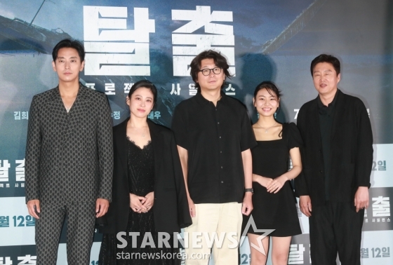 배우 주지훈, 박희본, 감독 김태곤, 배우 김수안, 김희원이 8일 오후 서울 CGV아이파크몰에서 진행된 영화 '탈출: 프로젝트 사일런스'(감독 김태곤) 언론시사회 및 기자간담회에 참석해 포즈를 취하고 있다.