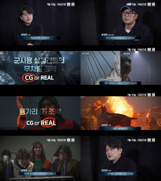 짙은 안개 속 연쇄 추돌 사고가 일어나고, 붕괴 위기의 공항대교에 풀려난 통제불능의 군사용 실험견들로부터 살아남기 위해 극한의 사투를 벌이는 사람들의 이야기 '탈출: 프로젝트 사일런스'(이하 '탈출')가 촬영 비하인드가 담긴 'CG or REAL 영상'을 전격 공개했다.