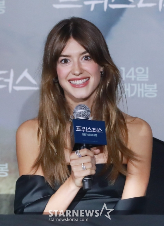 배우 데이지 에드가-존스가 7일 오후 서울 CGV용산아이파크몰에서 진행된 영화 '트위스터스'(감독 정이삭) 언론시사회 및 기자간담회에 참석해 질문에 답하고 있다.