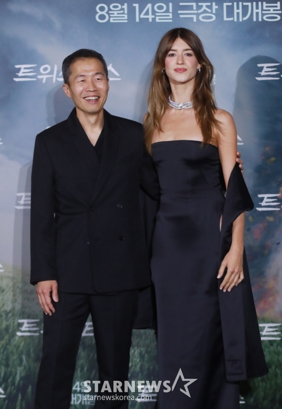 정이삭 감독, 배우 데이지 에드가-존스가 7일 오후 서울 CGV용산아이파크몰에서 진행된 영화 '트위스터스'(감독 정이삭) 언론시사회 및 기자간담회에 참석해 포즈를 취하고 있다.