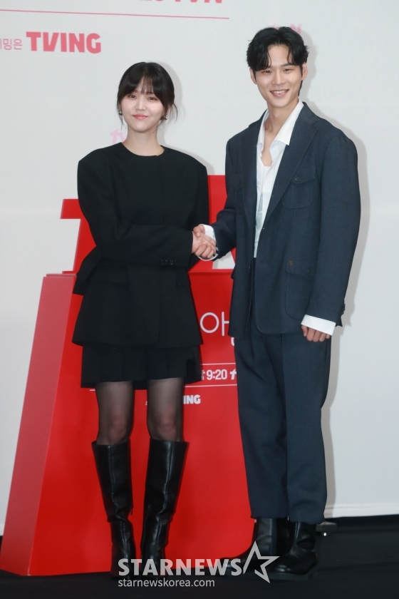 배우 김지은, 윤지온이 14일 오전 서을 구로구 신도림 라마다 호텔에서 진행된 tvN 토일드라마 '엄마친구아들' 제작발표회에 참석해 포즈를 취하고 있다.